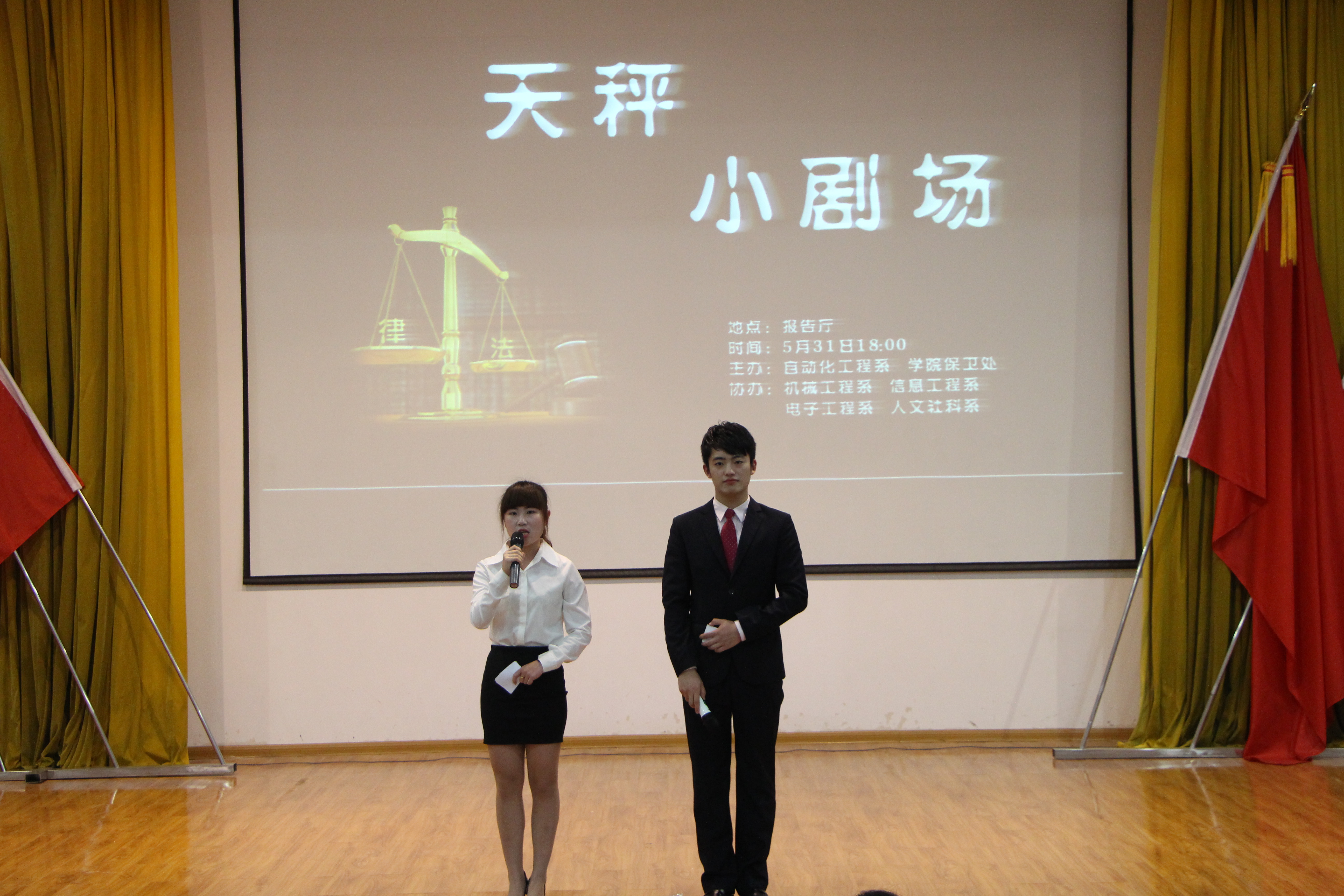 为了进一步增强同学们的法治意识,学会利用法律进行自我保护,做一个知法、守法的合格大学生,2016年5月31日18:00,由自动化工程系和学院保卫处主办、各系协办的“天秤小剧场”普法迷你剧演出在报告厅隆重举行。学院学工处姜振宇处长、李杰副处长、院团委书记何文晓和自动化工程系书记彭璐及各系学生干事、辅导员、学生到场观看本次演出。