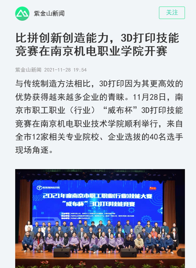 南京日报紫金山新闻对我校3D打印技能竞赛的报道