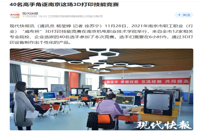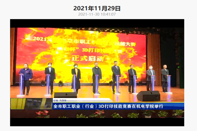 由我校承办的2021年南京市职工职业(行业)“威布杯”3D打印技能竞赛反响热烈,受到了新华日报,南京日报、现代快报、南京电视台、高淳电视台等多家媒体刊登报道。