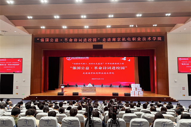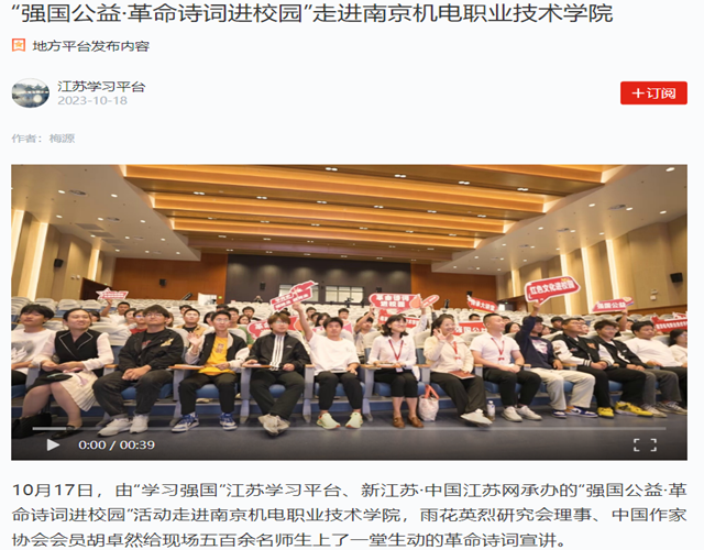 10月17日,由“学习强国”江苏学习平台、新江苏·中国江苏网承办的“强国公益·革命诗词进校园”活动走进星空体育·(中国)官方网站,雨花英烈研究会理事、中国作家协会会员胡卓然给现场五百余名师生上了一堂生动的革命诗词宣讲。