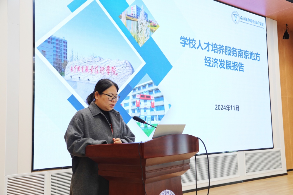 学校教务处处长陈云霞以《人才培养服务南京地方经济》为主题,从教学出发,阐述了教学与招生和就业之间的联系和不足。质控办主任吴伟萍以《挖掘平台数据,对标双高建设标准;推动专业建设,助力就业质量提升》为主题,对招生培养就业三方联动进行深入的分析