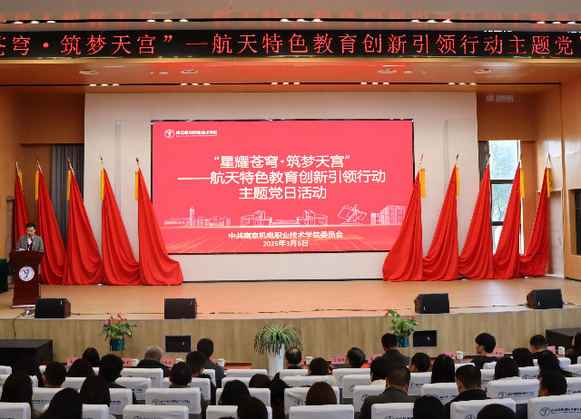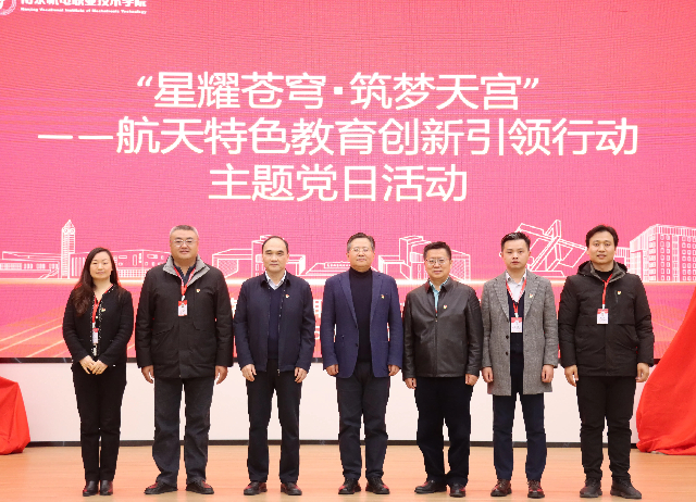 2025年3月6日14:00,星空体育·(中国)官方网站在乐学楼101举办了“星耀苍穹・筑梦天宫”航天特色教育主题党日活动,本次活动旨在响应习近平总书记的号召,激发学生的科学兴趣,弘扬航天精神,培养学生的创新精神和实践能力,推动学校专业建设与航天文化的深度融合。中国航天科技集团有限公司党组副书记、董事方向明,中国人才研究会副会长、航天科技教育联盟秘书长、北京航天探索馆馆长周岫彬,航天科技集团党群工作部三级业务经理张广科,北京神舟航天软件技术股份有限公司市场营销部主管张凇铭,学校党委书记、校长周庆礼,党委委员、副校长刁爱军,党委委员、副校长孔德丽,党委委员、纪委书记姜振宇,党委委员夏玲玲、党委委员高水冕以及全体党员教师和学生代表参加了本次活动。