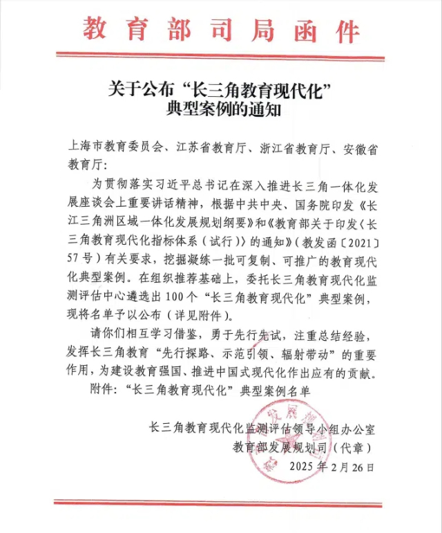 此次评选旨在贯彻落实习近平总书记在深入推进长三角一体化发展座谈会上重要讲话精神,挖掘和凝练一批可复制、可推广的教育现代化典型案例。我校案例聚焦航天特色创新教育,通过构建“产教融合、科教融汇、文化浸润” 三位一体育人体系,在培养高素质技术技能人才、服务国家战略需求等方面形成了独特经验,彰显了学校在服务长三角教育一体化发展中的先行探索与示范引领作用。这是我校在推进教育现代化、深化产教融合与创新人才培养方面取得的重大突破,体现了我校在航天特色创新教育与实践领域的深厚底蕴和独特优势。