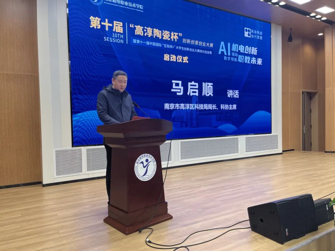 2025年3月18日,“AI驱动机电创新,数字领航职教未来”星空体育·(中国)官方网站第十届“高淳陶瓷杯”创新创意创业大赛暨第十一届中国国际“互联网+”大学生创新创业大赛校内选拔赛启动仪式在乐学楼102报告厅举行。南京市高淳区科技局局长、科协主席马启顺,南京高淳高新技术产业开发区管理办公室分管负责人倪友谊,南京高等职业教育创新创业园发展服务中心主任吴凯,江苏高淳陶瓷股份有限公司党委副书记、副总经理周玉明,学校党委委员、副校长刁爱军等领导出席启动仪式。300余名师生代表参加活动,共同见证大赛开幕。