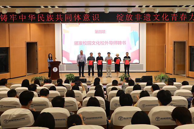 活动当天,启动仪式拉开帷幕。《何为青年》朝气蓬勃的表演瞬间点燃全场气氛,赢得阵阵掌声。学校党委委员、副校长刁爱军和高淳区文化和旅游局副局长史新华依次上台致辞。他们的话语情真意切,既表达了对活动的殷切期望,也传递出对非遗传承工作的高度重视,让在场所有人感受到非遗保护的重要意义。刁爱军为非遗传承人颁发聘书,邢响生、夏小玲、邢志鹏、范磊、李逢斌五位非遗大师正式受聘为校园文化校外导师。高淳区文化和旅游局党委书记、局长毕涛,学校党委书记、校长周庆礼共同为“校地合作”非遗民俗文化传承保护基地揭牌,开启了非遗传承的全新篇章!