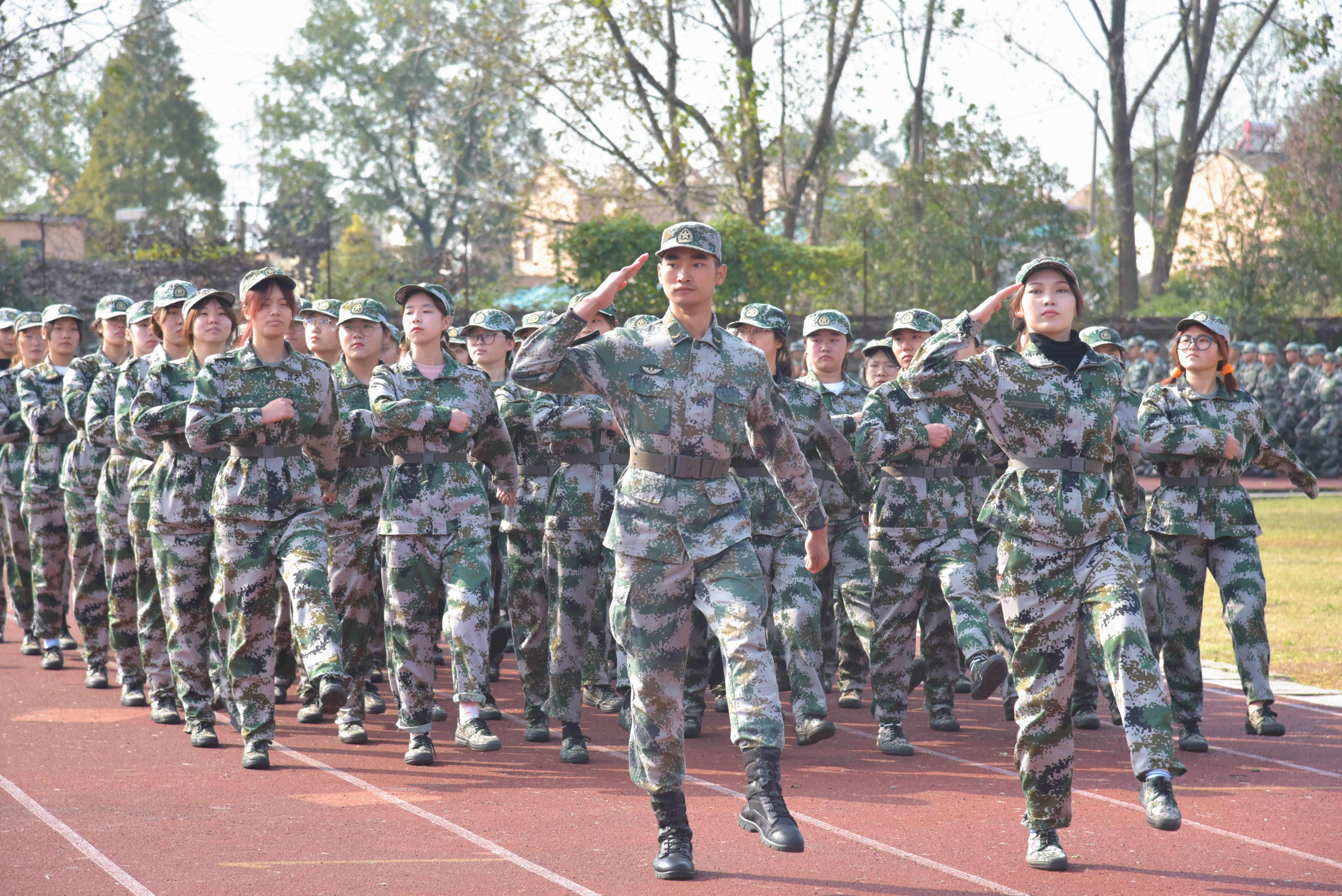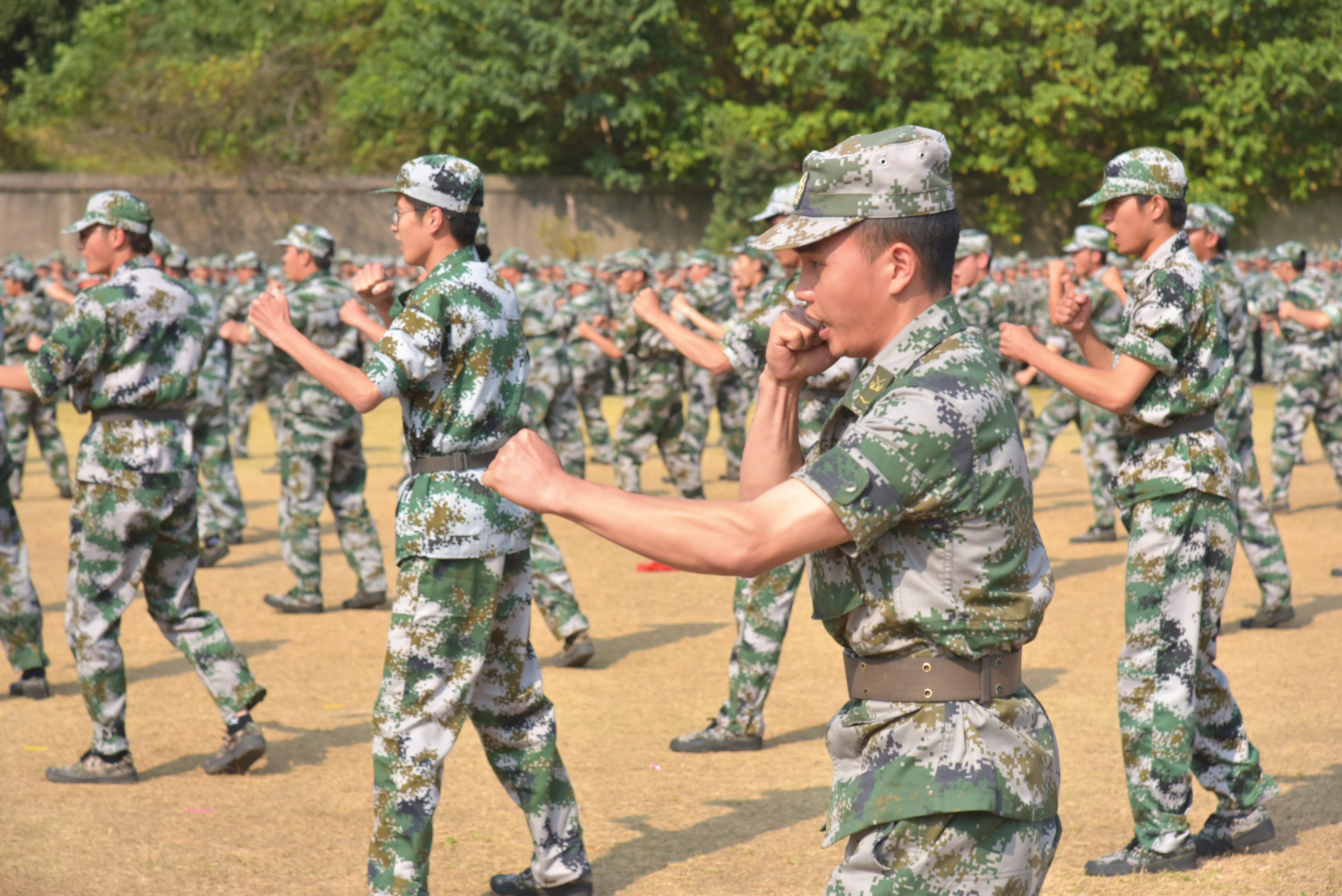 随后进行了军事成果汇报。队列展示、擒敌拳、匕首操等军事实用技能的表演展示了大一新生们15天的军训成果及良好的军事素养,运动场上掌声不断。