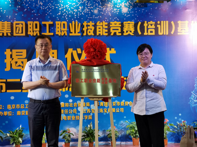 7月28日上午,南京新工投资集团职工职业技能竞赛(培训)基地揭牌仪式暨南京市二级首饰营业员技能大赛在学院中央门校区报告厅举行。市总工会党组成员、副主席陈慧男,新工投资集团党委副书记、工会主席吴启宁,新工投资集团党委委员、总经济师洪薇,学院党委书记、院长周庆礼,学院党委委员、副院长孔德丽,学院党委委员、工会主席姜振宇及市总工会、新工投资集团有限公司相关领导,新工集团各直属企业工会主席及负责培训工作领导出席本次活动。