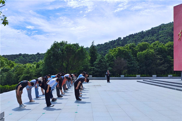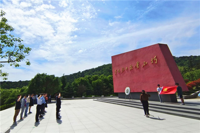 游子山烈士陵园坐落在游子山南麓。在游子山革命烈士陵园烈士纪念碑前,全体人员整齐列队,向烈士纪念碑敬献花圈、默哀鞠躬,以此表达对战争年代、峥嵘岁月中甘于奉献、不怕牺牲,为共产主义事业奋斗终身的先烈们的追思和缅怀。随后,在党支部书记胡枫同志的带领下,全体人员面向党旗,高举右手重温入党誓词,以表达向革命先烈学习的决心和坚决忠诚于党的初心。紧接着,全体同志依次迈过台阶,有秩序地绕碑瞻仰烈士事迹。