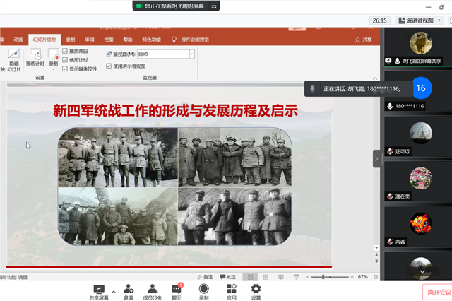 4月20日下午,机关一支部通过腾讯会议平台开展线上政治学习。支部书记彭璐主持会议,邀请了思政中心胡飞霞老师给全体与会教职工作了主题为“新四军统战工作的形成与发展”的讲座