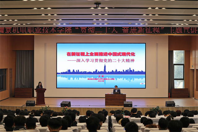 会议邀请到江苏省委宣讲团成员、南京航空航天大学马克思主义学院院长、教授、博士生导师王智以《在新征程上全面推进中国式现代化——深入学习贯彻党的二十大精神》为题作主题宣讲。王教授从中国式现代化与实现中华民族伟大复兴的历史进程、在新时代历史性成就和历史性变革中开启新征程等四个方面系统梳理了中国式现代化的科学内涵、鲜明特色、本质要求和前进道路上必须牢牢把握的重大原则,同时全面对标对表党的二十大作出的战略部署和安排,为我校师生深入解读了习近平总书记为江苏擘画的建设“强富美高”新江苏的宏伟蓝图。