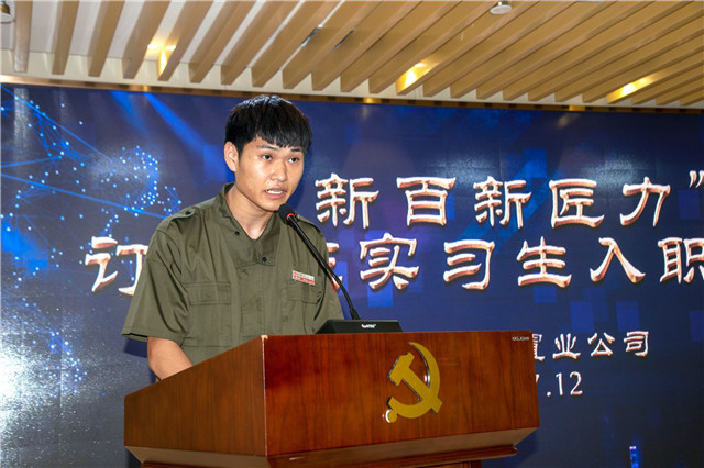 入职仪式上订单班学生代表袁亚宁发言,他首先感谢新百集团给我校学生提供了这样一个难得的机会,也感谢学校领导和教师们的栽培之恩;他表示在新百集团,将坚守责任,勇于担当,勇于进取,追求卓越。随后,我校赵学洪副院长与南京新百集团副总裁、公司董事长周雷分别代表校企双方致辞,对“新百新匠力订单班”实习生提出殷切期望。