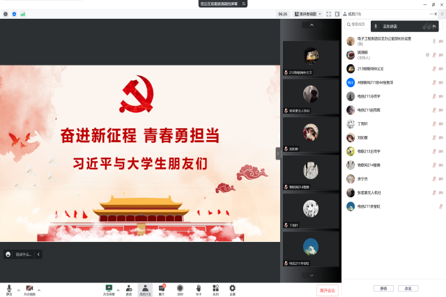 2022年11月15日18点30分,电子工程系团总支组织召开了全系学干线上研讨会。为进一步学习习近平新时代中国特色社会主义思想,本次研讨会通过品读《习近平与大学生朋友们》一书为切入点,通过品读与讨论,旨在帮助学生干部们增长见识,提高分析问题和解决问题的能力。