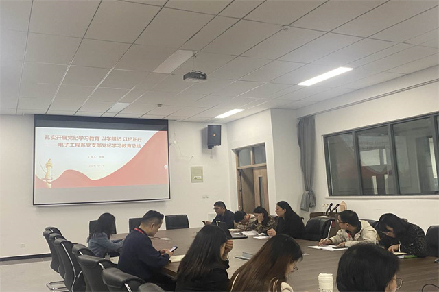 电子工程系主任姚小冬,支部副书记陈雪,副主任丁向琴,以及支部全体党员参加本次总结会。自2024年4月-10月,系党支部面向支部全体党员开展了党纪学习教育,支部通过开展读书班学原文、小组讨论发言、观看廉洁警示片、实地参观周恩来故居、淮安廉政府署、典型案例剖析、拍摄廉洁家风视频等多样化的学习,让党纪学习教育真正落细落实。