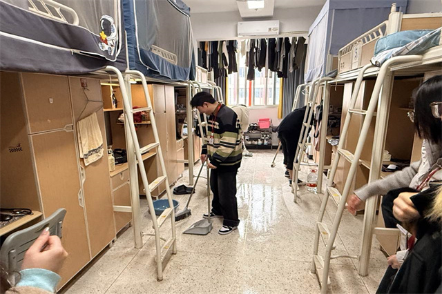2月25日下午,为了进一步优化学生的学习生活环境,培养学生的良好卫生习惯,电子工程系积极响应学校号召,组织了一场全面彻底的宿舍卫生整顿行动。此次行动由系党员同志带队,深入学生宿舍,亲自动手与学生一同打扫卫生,共同营造整洁、舒适的居住环境。