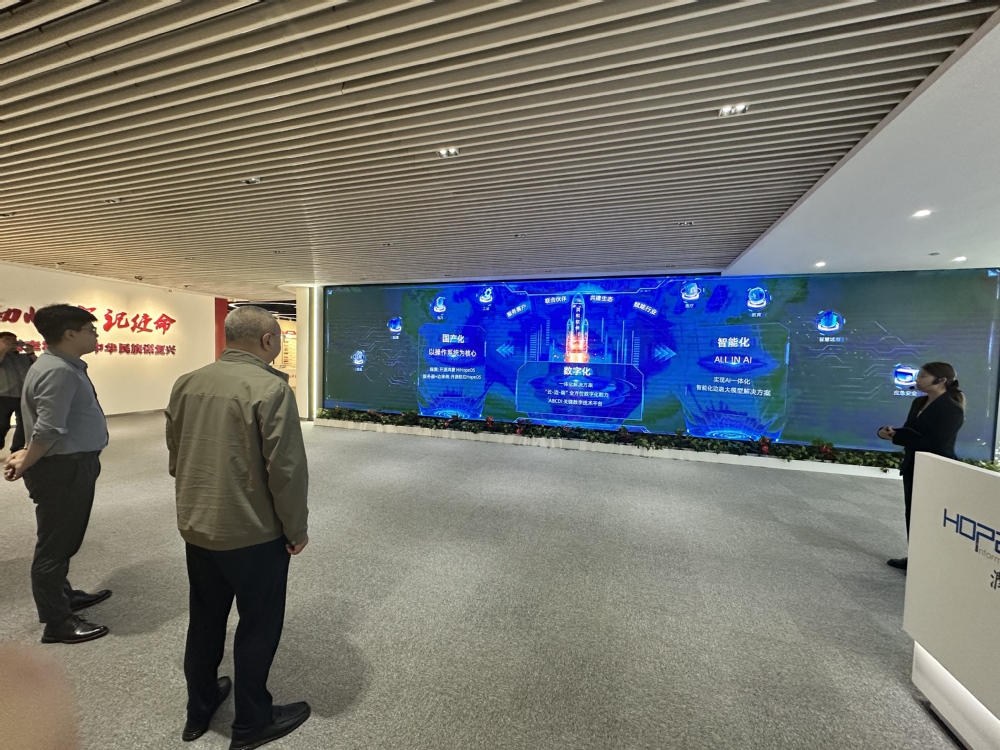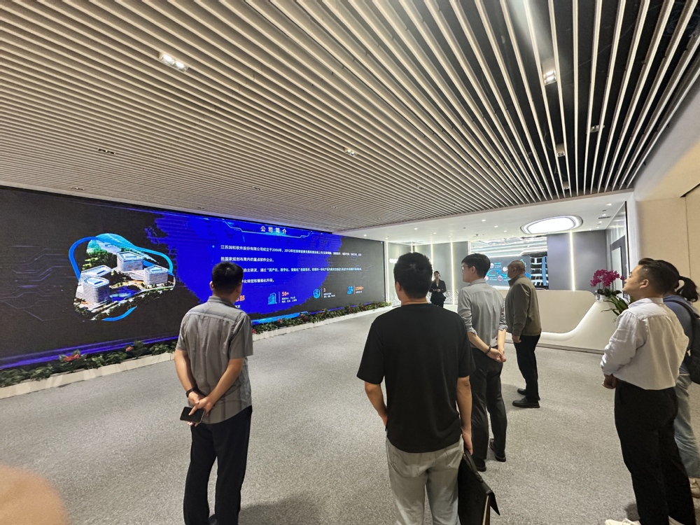 会谈结束后,总经理刘太俊带领校方代表团参观润和软件展厅,详细介绍公司在金融科技、工业互联网、智慧城市等领域的业务布局及典型落地案例。从鸿蒙生态的智能终端解决方案到信创领域的国产化实践,展厅内的技术成果与应用场景直观展现了润和软件在数字化转型中的技术实力与行业洞察力,为双方后续合作提供了具象化参考。