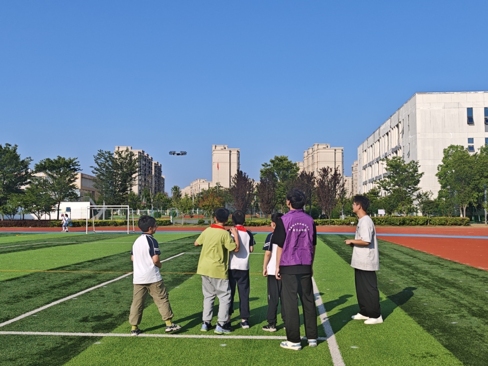 最激动人心的试飞体验环节在操场展开。志愿者们严格按照安全规范,分组为小学生们进行无人机飞行演示。随着螺旋桨快速转动,无人机平稳升空,在空中完成悬停、旋转、360度环绕等一系列精彩动作,引得孩子们惊叹连连,欢呼声此起彼伏。在确保安全的前提下,志愿者们手把手指导小学生们进行简单的无人机操控体验。孩子们小心翼翼地握着遥控器,专注地盯着天空中的无人机,当成功让无人机按照指令完成飞行任务时,一张张稚嫩的小脸上绽放出灿烂的笑容,兴奋与自豪之情溢于言表。