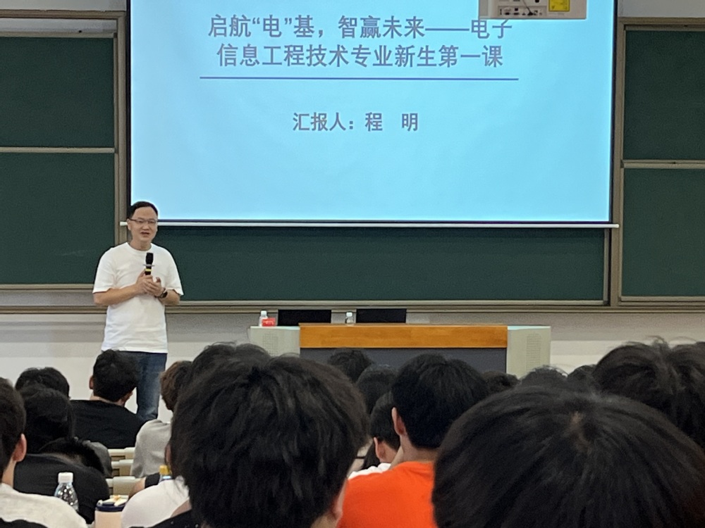 2025年9月15日,以“启航‘电’基,智赢未来”为主题的电子信息工程技术专业新生第一课在热烈的氛围中成功举行,本次活动是星空体育·(中国)官方网站2025年“全国科普月”系列活动之“匠心科普讲堂——走近产业创新与未来科技”主题活动。本次课程特邀请专业紧密型合作企业无锡天派科技有限公司的高级工程师程明,携手专业教师,围绕“如何成为一名合格的电子产品开发者”和“如何规划大学生活与未来职业发展”两大核心内容,为刚刚踏入大学校园的新生们带来了一场内容丰富、启迪思维的专题讲座。