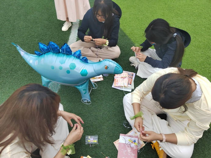 活动现场,同学们提笔写下“愿考试如正中靶心的箭,冲进前十”、“愿与室友如编绳般密不可分,拧紧温暖”、“希望未来奔赴热爱,成为闪光的自己”…… 这些真挚的文字,承载着同学们对未来的美好期许,贴满心愿墙,温馨动人。同时,五彩斑斓的丝线在同学们的指尖欢快跳跃,同学们相互切磋编织技巧、交流创作心得,一件件精美的手工艺品逐渐成型,这一过程,不仅提升了同学们的动手实践能力,更在互动交流中极大地增进了同窗情谊,让温暖与创意在指尖传递,编织出一幅和谐友爱的校园画卷。