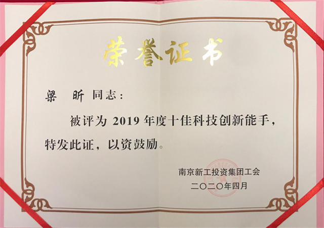 3月份,学院工会收到了南京新工投资集团关于评选2019年度十佳科技创新能手的通知,经电子工程系分工会推荐,学院工会审核上报,我院梁昕老师在此次评选中,荣获南京市新工投资集团“2019年度十佳科技创新能手”称号。