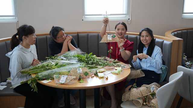 随后,参加活动的老师们根据指导老师的讲解,折竹片、系五彩绳、挂铃铛、系香囊,装叶材(艾草、菖蒲、玉簪叶等),最后调整好门挂的平衡点,就这样一个艾草香囊门挂就完成了。在制作的过程中,老师们欢声笑语、其乐融融,共同沉浸在轻松、愉快的活动氛围中。