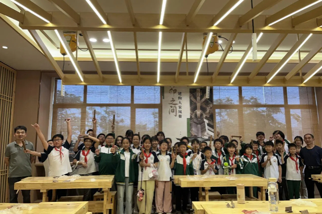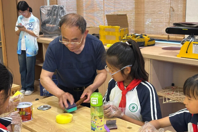 在非遗文化传承与创新中心,80余名中小学生在南通板鹞风筝工坊代表性人物何金泉,江苏省工艺美术名人、非遗传承人夏元安,学校人文社科系张萌老师等非遗艺术家的指导下深度体验南通板鹞风筝、精细木作技艺、非遗竹编的制作过程。孩子们在浓厚的非遗传承氛围中“玩”得不亦乐乎。