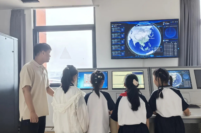 航天专业科普场馆建有全国职业院校首个“天地一体”航天科普阵地,包括航天科普馆、卫星地面接收站实验室、卫星测控中心,配套“航空航天装备智能制造技术”省级示范性虚拟仿真实训基地,创新“数字孪生+实景操作”虚实融合的科普阵地。学校卫星通信与导航技术专业负责人黄威老师,带领50余名中小学生实景操作卫星地面接收站并互动体验了卫星测控中心,孩子们无不惊叹于我国先进的航天科技。