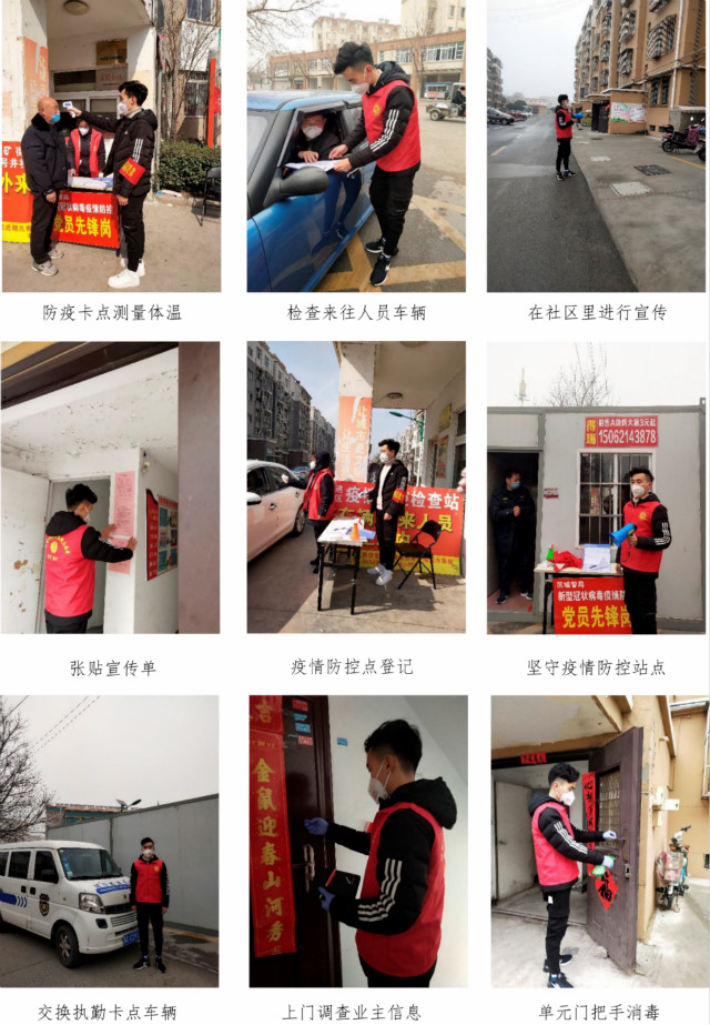 戴祯磊、徐志远、叶华澳、张睿等同学纷纷在自己的家乡,自愿作一名志愿者,贡献着自己的力量。协助防疫卡点测量体温,配合防疫点工作人员做好外来车辆和人员的排查登记,手持扩音器引导周边群众提高自我防护意识并佩戴号口罩,在楼道内张贴防疫宣传单,对每个单元门把手和楼梯道扶梯进行消毒,同时还协助工作人员进行上门调查。