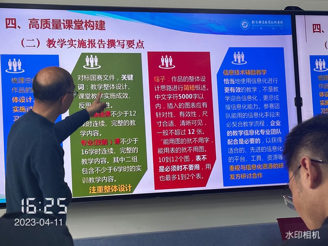 报告中引用了习近平总书记2018年5月2日,在北京大学师生座谈改革会上的讲话,座谈会上提出要把立德树人的成效作为检验学校一切工作的根本标准,真正做到以文化人、以德育人。开启职教新时代的核心制度设计中指出,职业教育高质量发展的新抓手——三教改革,教师:赋能教师以提升素养能力;教材:升级教材以推动教材改革;教法:激活教法以推动教学改革。职业教育高质量发展的最新要求中,刘教授带领我们学习了《关于推动现代职业教育高质量发展的意见》等文件精神、创新教学模式与方法、改进教学内容与教材。高质量课堂构建中指出教学设计是高质量课堂构建的起点、教学实施报告撰写要点、教学实施报告五部曲。