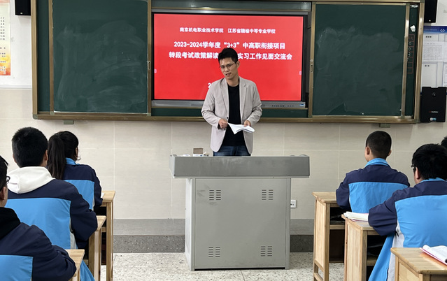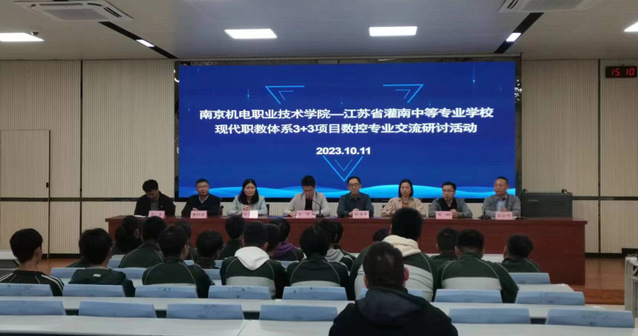在赣榆中专的交流活动共分三个阶段。活动第一阶段,吴老师深入2023级数控3+3班,给同学们上了“新生第一课”。课上,吴老师通过图文并茂的方式,从学校规模、办学特色、专业发展、数控专业的学习内容、升学渠道以及就业前景进行了详细介绍。第二阶段,双方就“3+3”中高职衔接项目进行交流,与会人员就数控技术应用“3+3”中高职衔接一体化人才培养方案制订及实施、课程建设、教育教学管理等内容进行了探讨交流,就技能大赛中高衔接学生队伍组建、如何加强衔接训练,提升竞技水平进行深入交流。活动第三阶段,毛主任深入21数控3+3班就即将举行的转段考试进行政策解读,就顶岗实习工作与全体同学进行了现场交流。