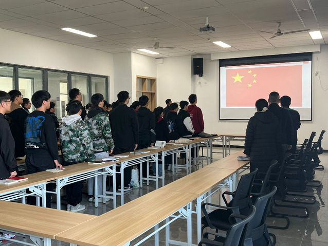 仪式在中华人民共和国国歌中拉开帷幕。全体成员认真严肃,仪态端正。