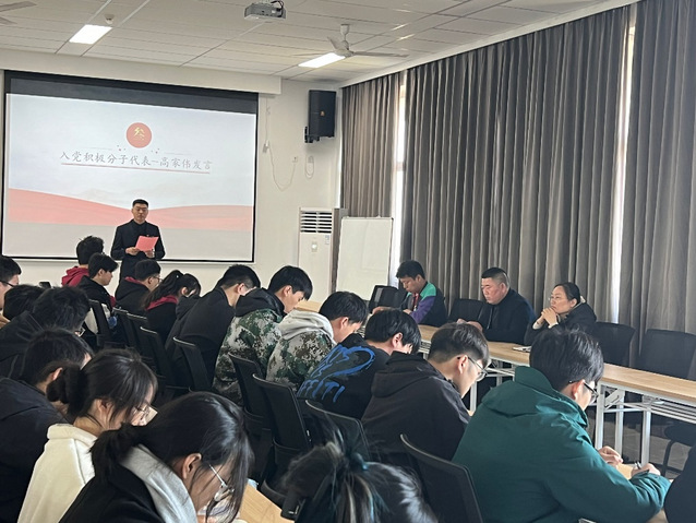 接着,入党积极分子代表高家伟发言,他提出我们要在以后学习和生活中,我们一定以“习近平新时代中国特色社会主义思想”为指导,以身边的优秀党员为榜样,按照新《中国共产党章程》的要求,以共产党员的标准严格规范自身的言行,为推进中华民族伟大复兴贡献自己的一份力量。