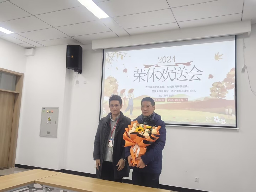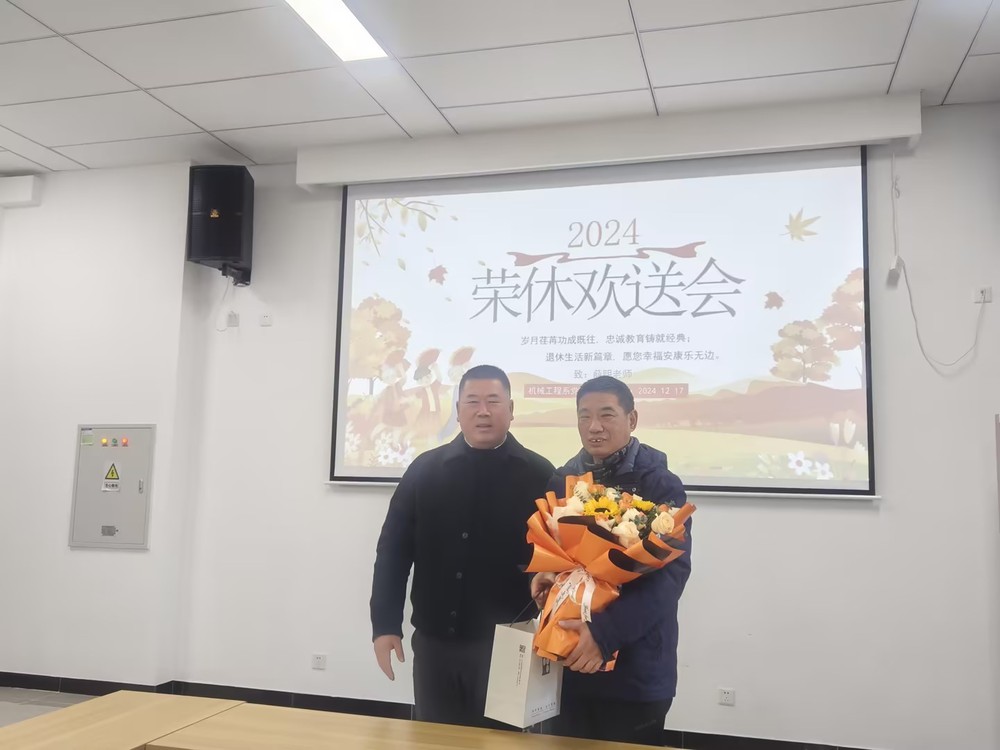 在全场热烈的掌声中,系部领导送上鲜花和纪念礼品。这份荣誉象征着学校和系部对他多年辛勤付出的高度认可与深深敬意。接过纪念品薛明老师感慨万千,他说道:“回首在机械工程系的岁月,心中满是感恩与不舍。感恩学校和系部给予我的肯定,同时让我能够与一群优秀的同事共事,见证一届又一届学生的成长与进步;不舍那熟悉的校园、可爱的学生和亲爱的同事们。虽然即将离开工作岗位,但我对教育事业的热爱永不磨灭,我会一如既往地关注学校和系部的发展,期待年轻一代的教师们能够传承和发扬机械工程系的优良传统,为培养更多优秀的专业人才而努力奋斗。”