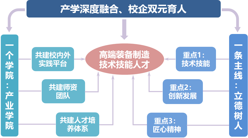 机械设计与制造专业以“一条主线、三项重点、一个学院、三个共建”为建设思路,即以立德树人为主线,以技术技能、创新发展、匠心精神为重点,建设产业学院,校企共建智能制造实践教学基地和企业工程实践平台、共建师资团队、共建人才培养体系,实现产教融合、教研结合、教创结合,培养高端装备制造技术技能型人才,深化“产学深度融合、校企双元育人”人才培养模式,见下图。