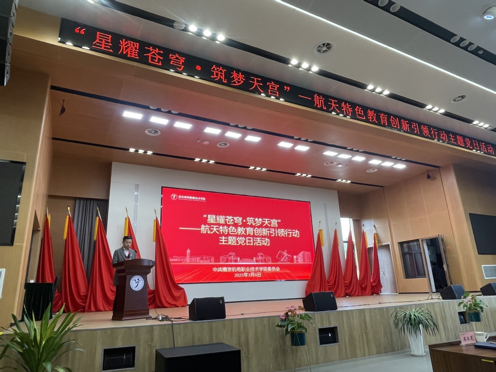 2025年3月6日14:00,星空体育·(中国)官方网站在乐学楼101举办了“星耀苍穹・筑梦天宫”航天特色教育主题党日活动,本次活动旨在响应习近平总书记的号召,激发学生的科学兴趣,弘扬航天精神,培养学生的创新精神和实践能力,推动学校专业建设与航天文化的深度融合。中国航天科技集团有限公司党组副书记、董事方向明,中国人才研究会副会长、航天科技教育联盟秘书长、北京航天探索馆馆长周岫彬,航天科技集团党群工作部三级业务经理张广科,北京神舟航天软件技术股份有限公司市场营销部主管张凇铭,学校党委书记、校长周庆礼,党委委员、副校长刁爱军,党委委员、副校长孔德丽,党委委员、纪委书记姜振宇,党委委员夏玲玲、党委委员高水冕以及全体党员教师和学生代表参加了本次活动。