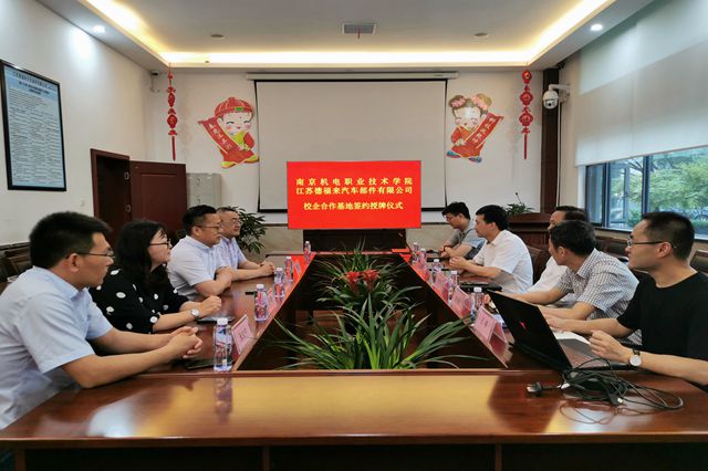随后,学院一行5人在泰兴市高新技术开发区管委会副主任邱明波的带领下分别前往苏德福来汽车部件有限公司、江苏佳佩环保机械设备有限公司进行校企合作专题对接活动。学院领导与企业领导就人才培养、项目合作等校企合作事宜进行了深入的交流,初步达成合作意向。学院分别与两家公司签订《就业创业实习实践基地建设协议》,并向两家公司授予“星空体育·(中国)官方网站大学生就业创业实习实训基地”铜牌。