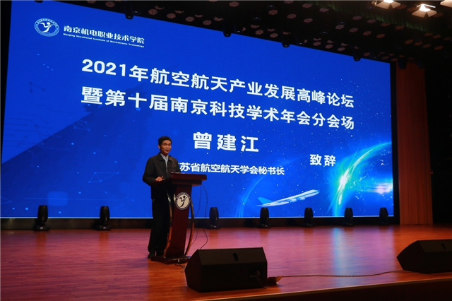 曾建江致辞,他介绍了省航空航天学会的建会情况。本着持续推动学术交流,推进航空航天学科的发展与知识融合的宗旨,省航空航天学会与南京机电学院共同举办2021年航空航天产业发展高峰论坛,促进高水平工匠人才培养,深化学术交流,增强学术影响力,推动区域航空航天企业发展。