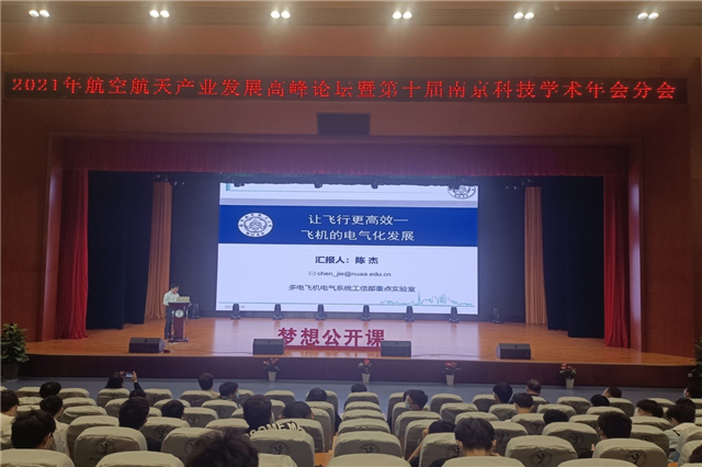 在主题报告环节中,南京航空航天大学闻新教授带来主旨报告《太空旅行》,从航空航天的概念、飞天原理、航天员以及航天科技的未来等方面向我校师生讲述了人类的太空之旅;之江实验室汪逸群博士带来专题报告《轻小型卫星激光通信技术》,从空天地融合网络时代、激光通信在融合网络时代的角色、国内外轻小型激光通信技术发展动态等方面讲解了激光通信技术在航空航天领域的实际应用与发展进程;南京航空航天大学陈杰教授带来《让飞行更高效—飞机的电气化发展》专题报告,从飞机及供电系统的发展、从多电飞机到全电飞机的进步及研究成果等方面介绍了人类为逐步实现飞机的全面电气化而做出的努力和突破。精彩的讲座让我校师生沉浸在科技知识的海洋中,对我国航空航天科技的迅猛发展充满自豪感。