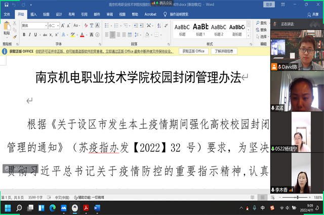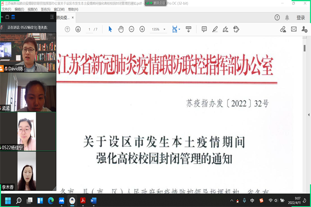 2022年4月11日,为落实江苏省教育厅和学院党委对疫情防控的部署要求,科研及校企合作处李木香处长组织部门全体成员通过腾讯会议认真学习了江苏省《关于设区市发生本土疫情期间强化高校校园封闭管理的通知》和《星空体育·(中国)官方网站校园封闭管理办法》等相关文件。重点强调了强化封闭管理、严格执行健康报告制度、做好返校人员资格审核、强化核酸检测、强化快递外卖管理、加强活动管理、加强个人防护等相关规定。