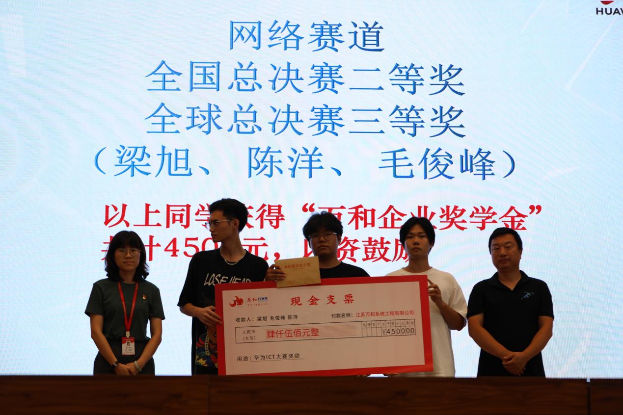 2023年9月19日下午,信息工程系特邀江苏万和系统工程有限公司副总经理苏正坤为软件技术、现代通信技术22级全体师生带来主题为“未来信息与通信技术发展及华为ICT学院介绍”的分享会。苏正坤向同学们分析了数字经济与就业岗位的现状与未来趋势,科普了华为ICT解决方案,介绍了华为ICT学院中相关的职业认证体系。苏正坤还为参加2022-2023华为ICT大赛的20级学生梁旭、 陈洋、毛俊峰颁发“万和企业奖学金”。