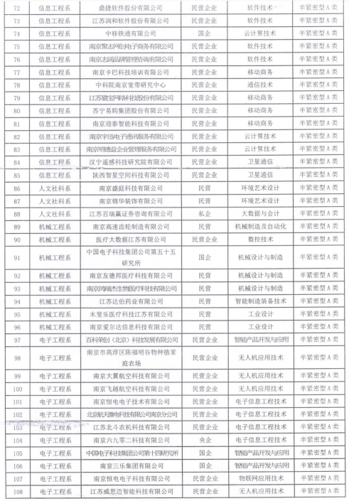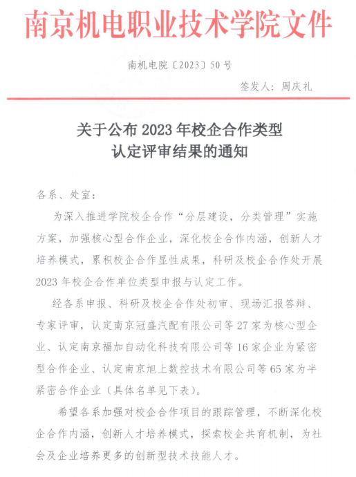 经科研及校企合作处初审、现场汇报答辩、专家评审,认定南京冠盛汽配有限公司等27家为核心型企业、认定南京福加自动化科技有限公司等16家企业为紧密型合作企业、认定南京旭上数控技术有限公司等65家为半紧密合作企业。
