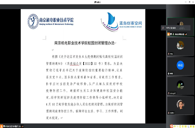 会后,教研室的双创班导师对所带班级进行了视频会议,了解了学生参赛过程中所涉及的做作品、做专利和工坊使用申请需求。特别强调“外卖不入校”规定,减少网购。对于参赛准备过程中所需购买的零部件一律“先消毒、后分派”,实行“校外+校内+个人”三次消毒制度,不要购买上海发出的快递,降低疫情输入风险。