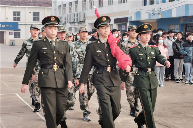 升旗仪式上,英姿飒爽的国旗护卫队迎着朝阳,伴随着激昂的《中国人民解放军进行曲》走向国旗台。在激昂的《义勇军进行曲》中,五星红旗徐徐展开,飘扬在校园上空。激发着全校师生不断向上的斗志,点燃了师生们的爱国热情。