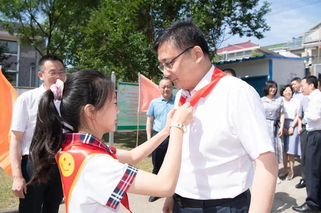 高淳区委书记吴勇强和区长刘伟也来到了戴俪尔希望小学,向全区少年儿童致以节日祝贺,向辛勤工作的广大教师和少儿工作者表示诚挚问候。少先队员们为吴勇强等区领导们佩戴了鲜艳的红领巾。