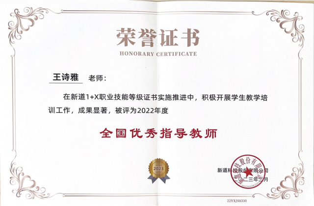 2022年大数据与会计专业在业财一体信息化应用“1+X”职业技能等级证书(中级)考培过程中,组织规范严格,成绩优异,通过率超过90%,学院被评为示范性考核站点,王诗雅老师被评为2022年度全国优秀指导教师。