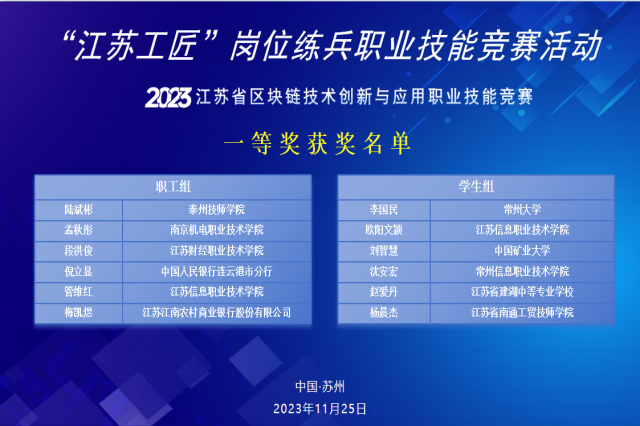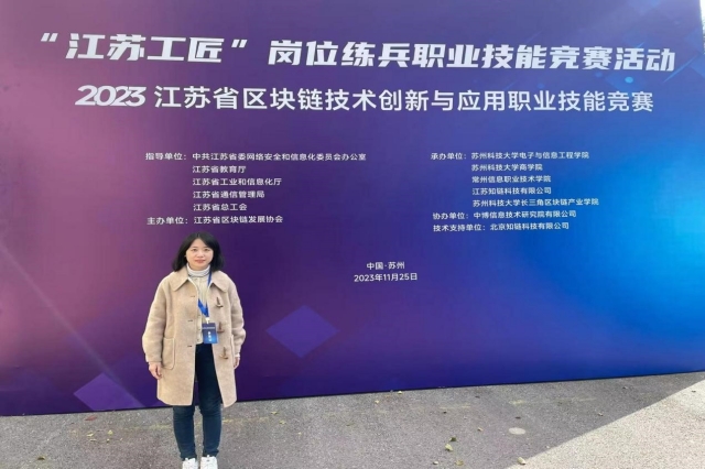 2023年11月25日上午,“江苏工匠”岗位练兵职业技能竞赛——2023年江苏省区块链技术创新与应用职业技能竞赛在苏州圆满落幕,来自省内院校、企事业单位的总计2000余人参加了本次竞赛。经过市赛选拔,我校孟秋彤老师进入决赛,最终以职工组第二名的成绩获得本次竞赛的一等奖,并被授予“江苏省五一创新能手”称号、“江苏省技术能手”称号,同时,星空体育·(中国)官方网站被授予优秀组织奖。