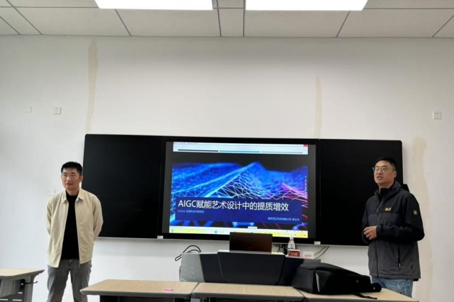 20241022日下午,艺术教研室视觉传达设计与制作团队邀请南京茂立科技有限公司的陶文斌和杨立为经理入校,开展了以“AIGC赋能艺术设计中的提质增效”为主题的研讨。本次会议由阮雪君老师主持。