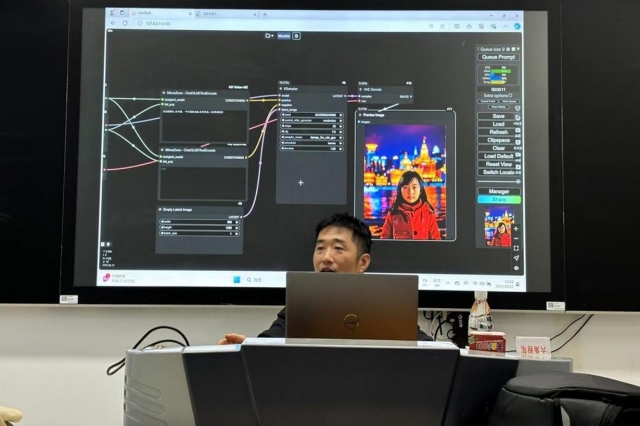 首先,杨立为经理对AIGC技术的起源、发展历程以及当前技术现状进行了简要介绍。同时,杨经理指出利用AIGC赋能艺术设计具有几个显著优势:其一,提升设计效率。AIGC技术能大幅提高设计效率,使设计师从繁琐的底层工作中解脱出来,将更多精力投入到创意策划和方案优化上。其二,拓展设计创意。AIGC能够打破人类固有思维定式的束缚,通过随机组合、跨领域迁移等方式激发更多元、更新颖的创意火花,有效拓展设计边界。其三,实现个性化设计。AIGC可依据不同用户的特征和需求,迅速生成个性化的设计方案,推动艺术设计向差异化、精准化发展。随后,他分享了一些AIGC在艺术设计中的实际应用案例,并现场演示了AI生成的步骤和效果。