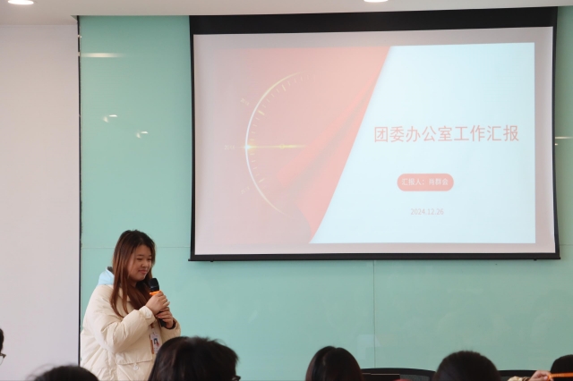 接着由各部门部长分别上台进行部门工作汇报。办公室部长肖群会从台账工作概述,会议记录,策划案撰写等进行总结;组织部部长陆澄晨从智慧团建、组织建设、团员发展、团费缴纳等工作进行汇报;宣传部部长周子翔从秀米推文、新闻稿、摄影录制等方面进行反思和总结;实践部部长闫欣雨从志愿服务活动、社会实践项目等汇报提出展望。
