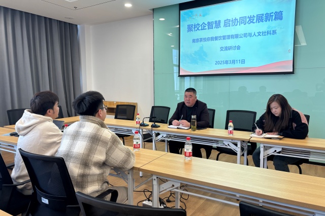 2025年3月11日,南京茶悦你我餐饮管理有限公司代表团一行莅临星空体育·(中国)官方网站人文社科系,就深化校企合作、共商本年度及明年合作计划展开深入交流与探讨。此次交流活动在人文社科系702会议室举行,为双方进一步的合作奠定了坚实基础。