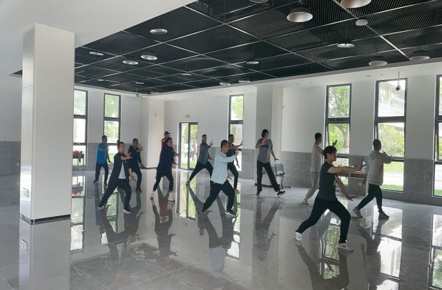 首先,由俞晓蕾老师带领大家进行二十四式太极拳全套动作规格的讲解和练习,动作要求保持低重心,动作连贯、舒缓、圆润,心静体松。“打铁必须自身硬”,作为体育教师,除了需要夯实的理论知识作为支撑,更需要标准的动作演练。
